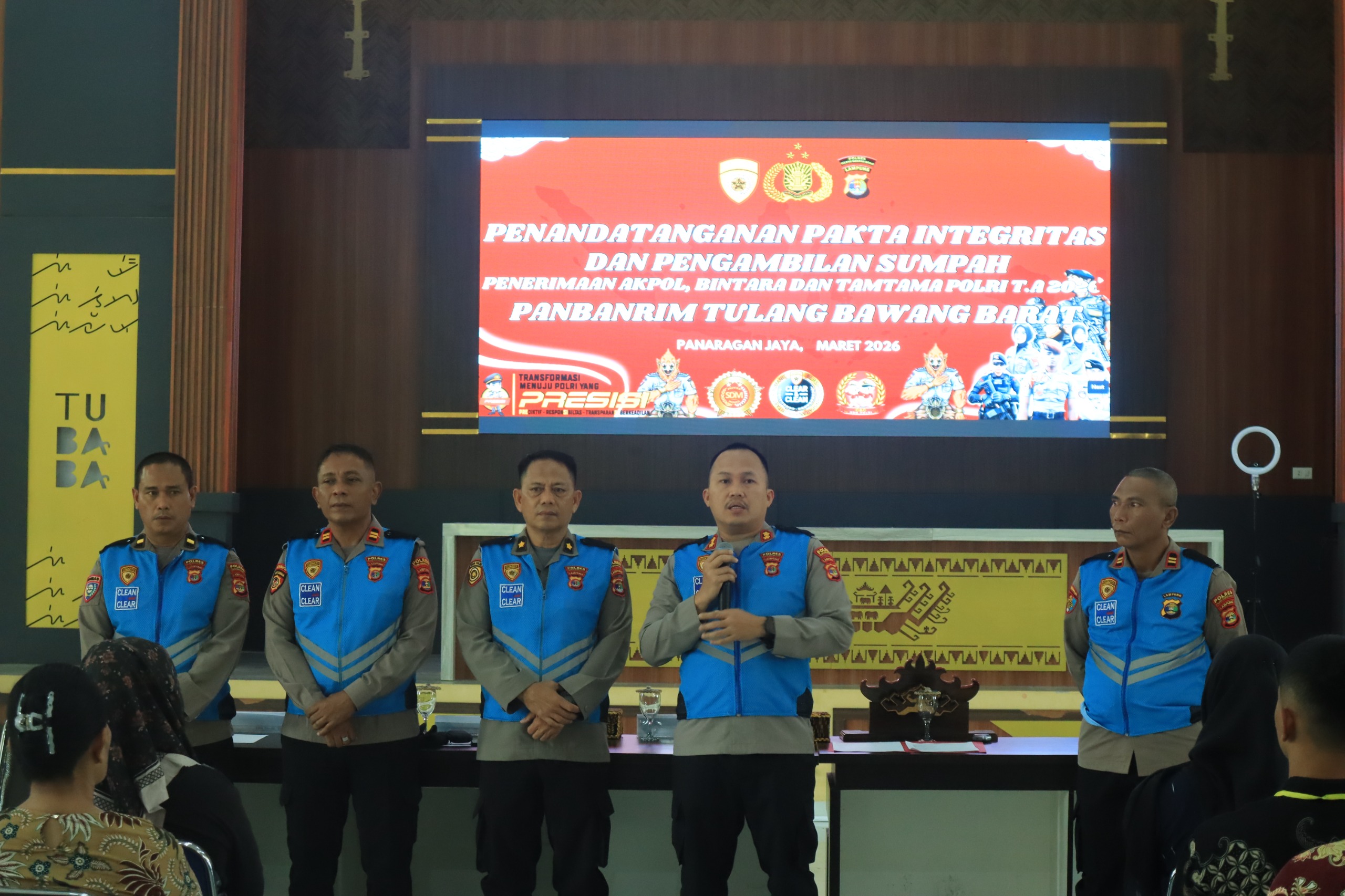 Tulang Bawang Barat_Khatulistiwa1972.com- Kapolres Tulang Bawang Barat Polda Lampung AKBP Sendi Antoni, S.I.K., M.I.K. di dampingi Kabag SDM Kompol A. Pancarudin, S.H., M.M. memimpin kegiatan penandatanganan Pakta Integritas penerimaan Terpadu anggota Polri Terpadu Tahun Anggaran 2026 yang digelar serentak di seluruh Indonesia, Kegiatan tersebut berlangsung di Aula Sarja Arya Racana Mapolres Tubaba. Selasa ( 31/03/2026) Siang