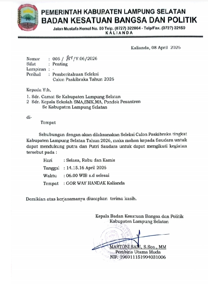 ” Pihak Kesbangpol Lampung Selatan pun sudah mengatakan bahwa rapat persiapan sebelum seleksi sudah diberitahukan, serta surat rekomendasi juga sudah ditangan camat , jadi pihak Kesbangpol telah melakukan sesuai juknisnya,” terang salah satu kepsek SMA di Jatiagung di ruang kerjanya, selasa (28 April 2026)