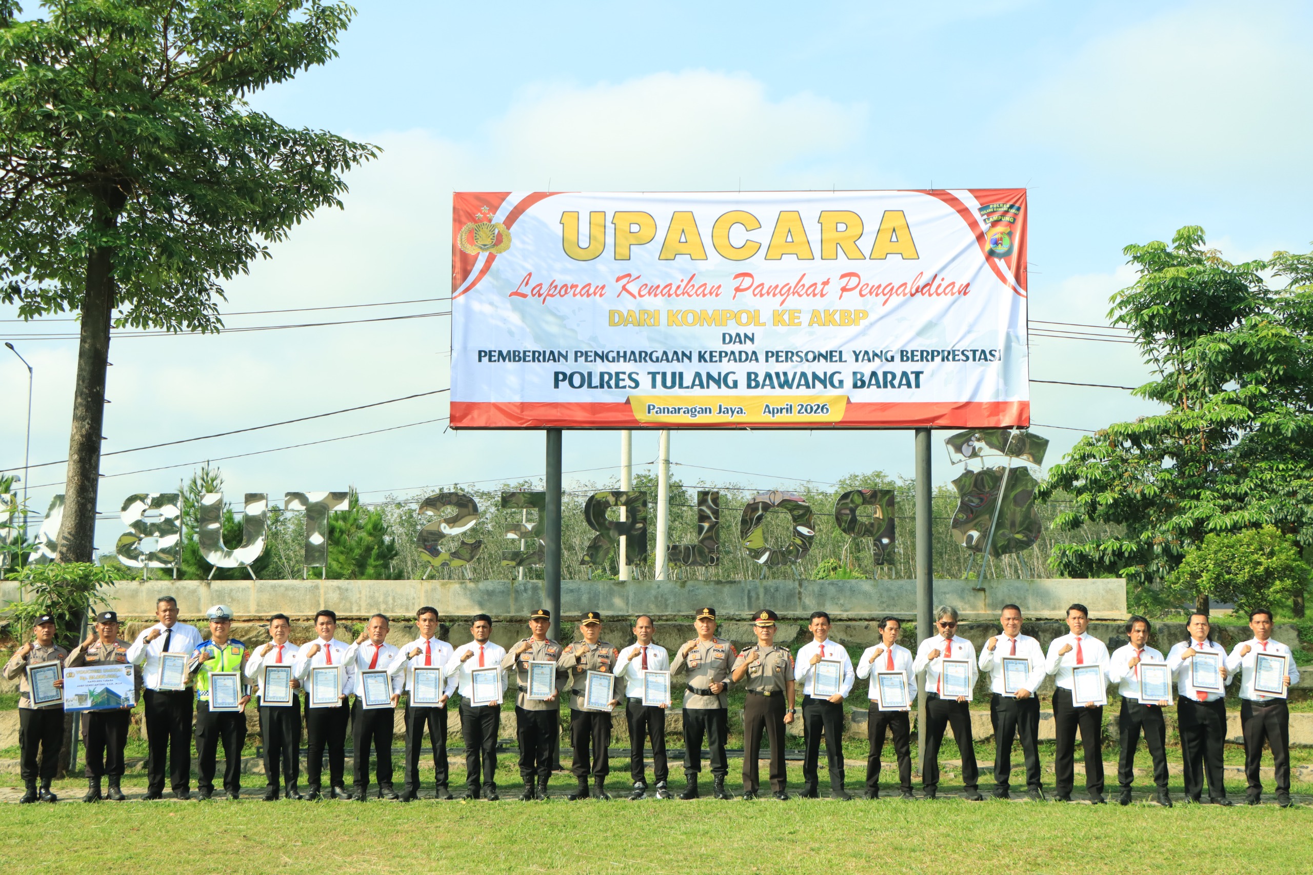 Tulang Bawang Barat_Khatulistiwa1972.com- Polres Tubaba Polda Lampung melaksanakan upacara kenaikan pangkat pengabdian bagi perwira Polri setingkat lebih tinggi dari Komisaris Polisi (KOMPOL) Menjadi Ajun Komisaris Besar Polisi (AKBP) dan Pemberian Penghargaan bagi Personel yang Berprestasi serta Pemberian Reward Umroh Personel bertempat di Lapangan Upacara Mapolres Tubaba. Selasa (31/03/2026).